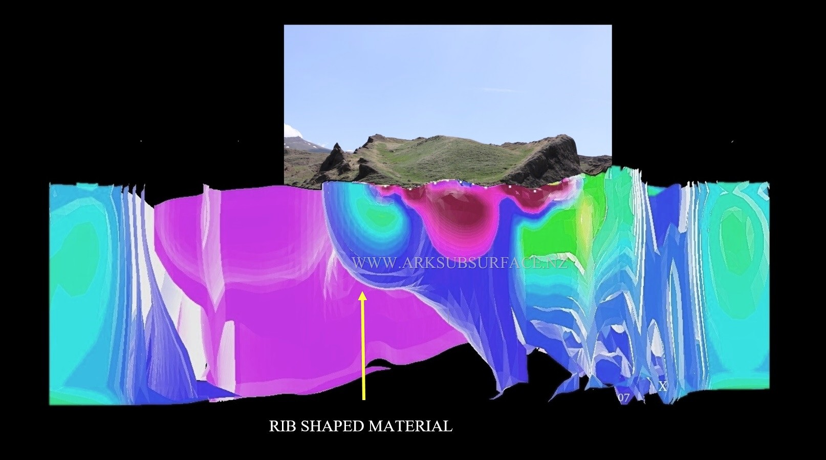 At the rear (stern) of the ship, there is material that has the shape of a massive rib, which is attached to the central keelson. On the composite resistivity image below, which is superimposed onto a photograph of the Ark, the rib shaped material and keelson are both displayed as a blue colour.