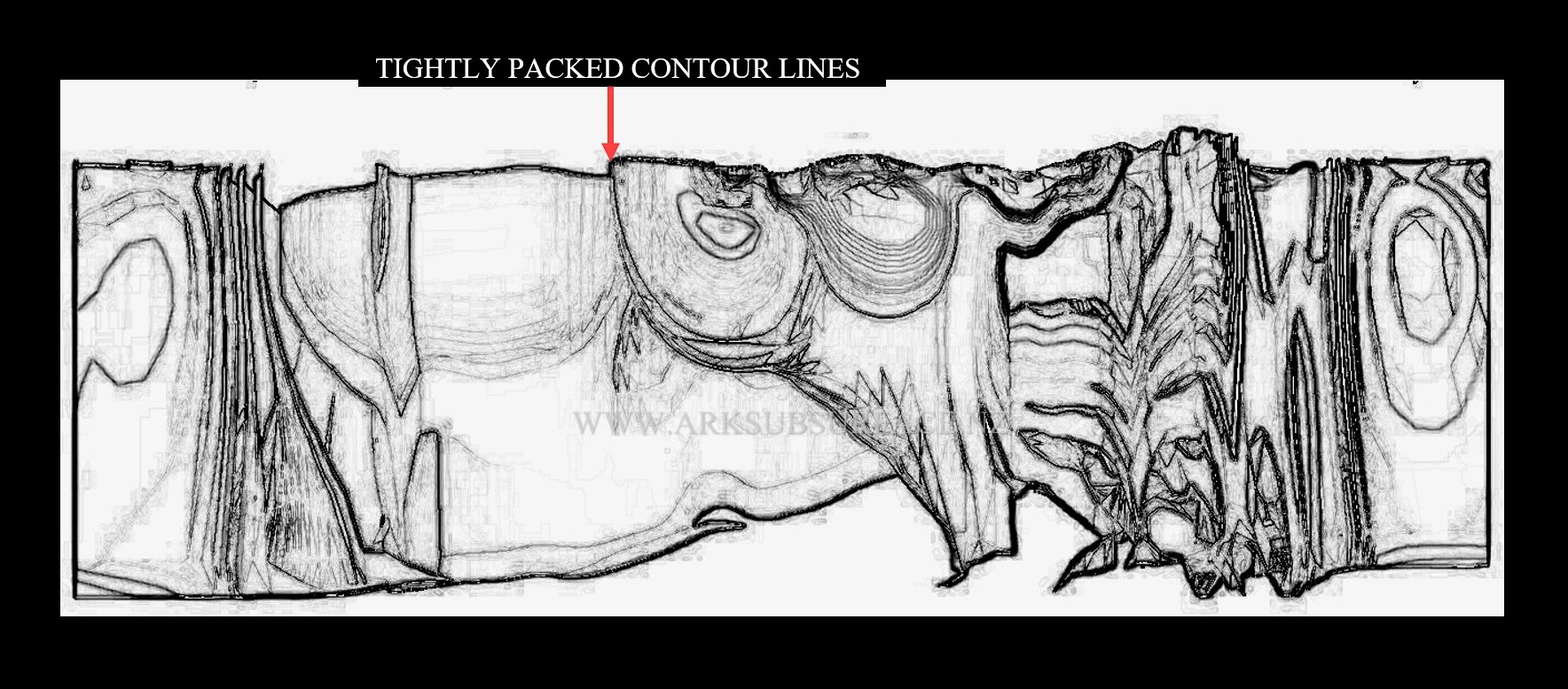 A contour map of the resistivity image, shows that the contour lines pack tightly around the boundary of the rib shape. This indicates that a very sudden change in material properties exists at this boundary between the rib shape material, and the material that is attached to the outside edge of the rib.