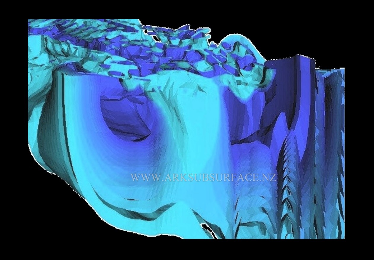 A contour map of the resistivity image, shows that the contour lines pack tightly around the boundary of the rib shape. This indicates that a very sudden change in material properties exists at this boundary between the rib shape material, and the material that is attached to the outside edge of the rib.