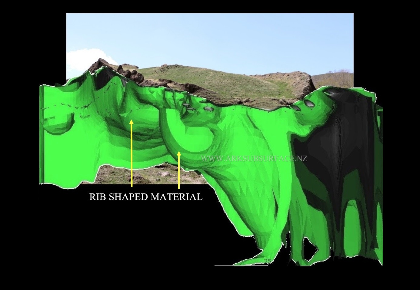 The inner and outer surfaces of the rib shaped material have a semi-circular profile. The resistivity of this material increases towards the inside edge of the rib, which is consistent with a material such as timber that has a varying degree of either moisture, or petrification within it.