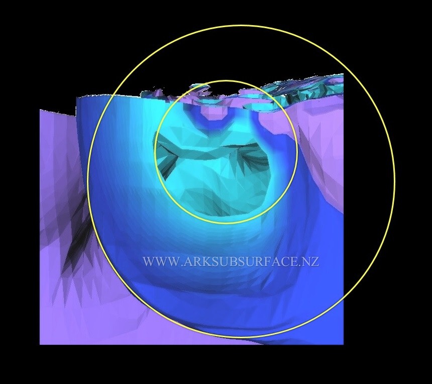 When a 3d view of the resistivity image of the rib shaped material, is combined with a photograph of the ship that is taken from the same angle, the position of the rib at the back of the ship can be seen, as well as another rib further towards the middle of the ship. The massive size of the rib shaped material which surrounds the inner hull structure, and the central keelson, are both proportional with the overall size of the ship.